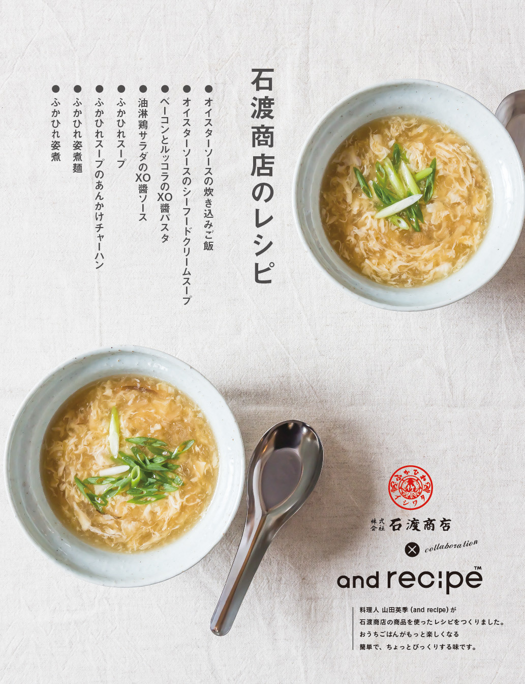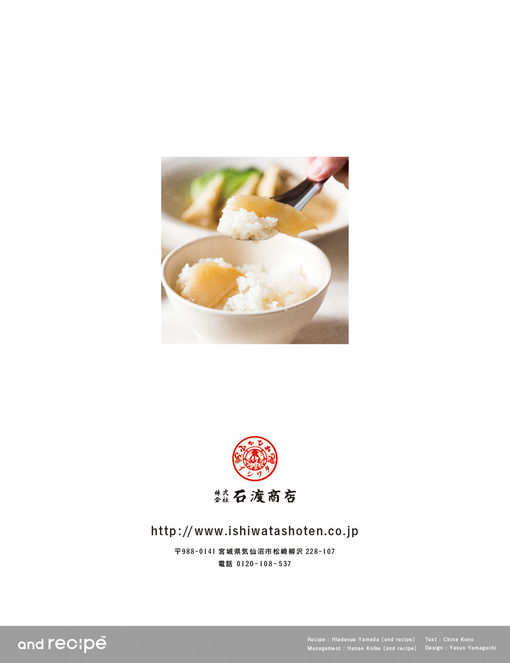 気仙沼石渡商店のレシピ and recipe 山田くんのレシピ、コーディネートによる冊子のデザイン、ディレクション。 冊子内のストーリーは甲野千奈 レシピ 山田英季(and recipe) 進行 小池花恵(and recipe) 編集 甲野千奈